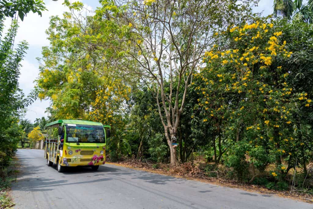 Ko Lat I-Tan has been promoted as an agricultural tourism destination, blending cultural experiences with its scenic beauty. It is accessible via a tram service from Wat Rai Khing, catering exclusively to group tours. The route includes stops at the following sites: Wat Rai Khing – Klong Phi Suea Museum – Ban Suan Bang Toei Homestay – Tao Tai Monastery – Tai Xuan Guan Monastery – Wat Song Khanong – Rai Saen Rak Organic rice fields. For further details contact, Tel. (66) 3422 5572 ext. 52
