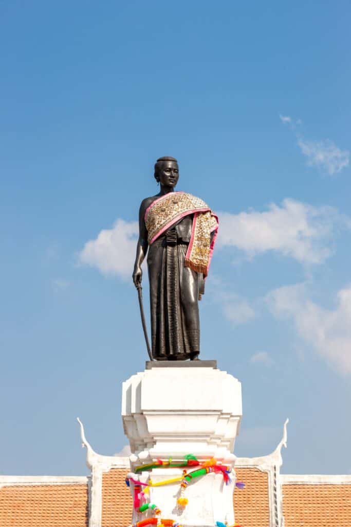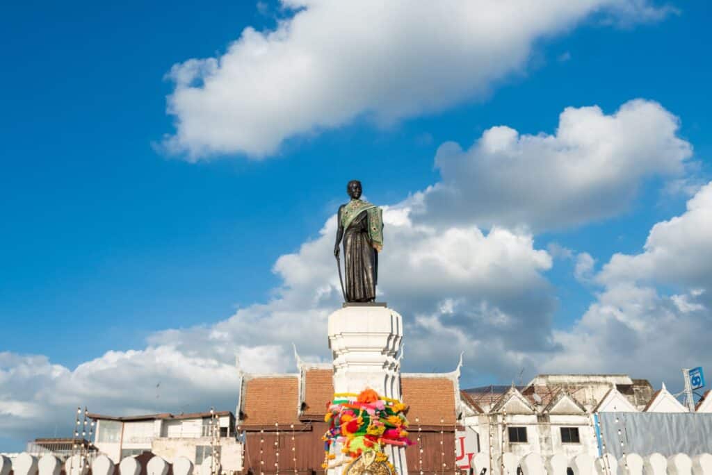A symbol of valour and patriotism, stands between Ratchadamnoen Road and Chumphon Road. Completed in 1934, it commemorates the bravery of “Khun Ying Mo” or “Thao Suranari”, famously recounted in the chronicles of the suppression of the Vientiane rebellion, first published in 1926. The chronicle narrates: “In April 1826, the army of Vientiane, upon realizing that the forces from Bangkok had advanced to Phra Phutthabat, swiftly retreated to Nakhon Ratchasima. The Royal Palace in Bangkok then stationed troops in Saraburi, preparing for a major assault on Vientiane. In Nakhon Ratchasima, the Vientiane forces began to forcibly relocate the locals to Vientiane. Khun Ying Mo, the wife of the deputy governor of Nakhon Ratchasima, was among those captured. She cleverly devised a strategy to delay their journey and wait for others at Thung Samrit. Seeing their number advantage, the captives, both men and women, overpowered their guards, seizing weapons and fighting back” Following the defeat of the Vientiane army, King Rama III graciously bestowed upon Khun Ying Mo the title “Thao Suranari”. She was a woman of sharp intellect and strategy, skilled in chess, and sword fighting, and proficient in riding elephants and horses. Loved dearly by the locals, she passed away in April 1852 at the age of 81. The government and people erected the Thao Suranari Monument in her honour. The statue, cast in black-coated bronze, stands 185 centimetres tall and weighs 325 kilograms. Dressed in royal regalia, she stands with her right hand on a sword, its tip touching the ground, and her left hand on her waist, facing West towards Bangkok. Her ashes are enshrined in the base of the monument. This was the first monument in Thailand dedicated to a commoner woman. An annual celebration of Thao Suranari’s victory takes place from 23 March to 3 April. Behind the monument lies the Chumphon Gate, built with large stones and bricks, plastered over,