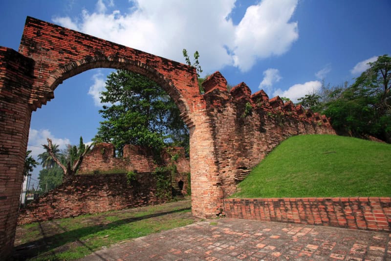 The City Wall of Nakhon Si Thammarat The City Wall of Nakhon Si Thammarat is the emblem of the ancientness, fortitude, prosperity, and the long history of the province. It is located along Khlong Na Muang Canal, Moom Pom Road, Amphoe Muang, Nakhon Si Thammarat. According to the legend of Nakhon Si Thammarat, the city wall was built during the reign of Phra Chao Sithamma Sokarat when founding the city on Had Saai Kaew. He constructed the rampart surrounded by a ditch. It is assumed that the wall and many parts of the city have been renovated several times. Still, the old line of the city wall was well-preserved. In King Narai Maharat’s era, French engineers and architects visited Thailand. Therefore, Thai city wall during that time was built in Chateau style, including the City Wall of Nakhon Si Thammarat nowadays. Subsequently, during the reign of King Rama II, which Phraya Nakhon Si Thammarat (Pat) ruled the city, the wall was given a renovation again. When Chao Phraya Yommarat (Pan Sukhoom) was appointed as Phraya Sukhoom Vinai (Samuha Tesa Piban) or the regent of Nakhon Si Thammarat. He pulled down the dilapidated wall (the sema stones still clearly seen though), and used those bricks to build roads along the inner city wall. The Fine Arts Department of Thailand has renovated some parts of the northern wall. The sema stones and the old fort line still remain, and are easily seen. However, other parts of the wall had tumbled down, only the brick ruins are left. The City Wall of Nakhon Si Thammarat is the emblem of the ancientness, fortitude, prosperity, and the long history of the province. The City Wall of Nakhon Si Thammarat has the shape of a rectangle, with the territory details as the followings;1.The North: 11 sen and 10 wa wide. (sen: unit of length equals 40 metres/ wa: equals 2 metres) Nowadays, the east side of the fort line is attached to Wat Moom Pom, and the west is adjoining to Nakhon Si Thammarat Prison. There is a canal at the front as the ditch.2.