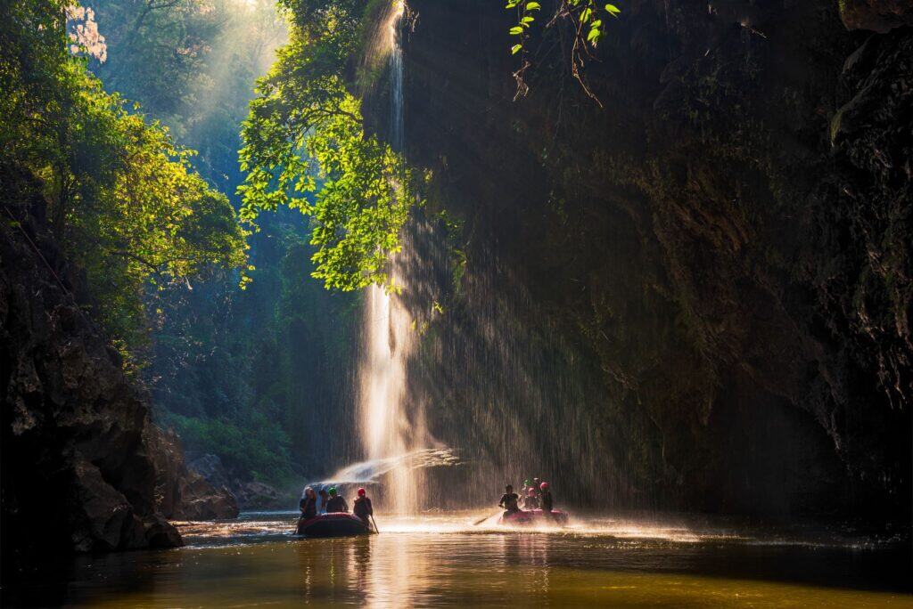 Key Attractions: Thi Lo Su Waterfall The largest limestone mountain waterfall in Thailand, located 900 metres above sea level, originating from Klo Tho Creek cascading along a steep cliff. This multi-tiered waterfall flows strongly all year round. It is about 500 metres wide and 300 metres high, surrounded by lush evergreen forest. The name “Thi Lo Su” comes from the Karen language, meaning “black waterfall.” To get there: By car-From Umphang District, follow Highway No. 1090 (Umphang-Mae Sot route) and take a right turn at Km. 161 (Ban Mae Klong Mai) onto Highway No. 1288 (Ban Mae Klong Mai -Beung Keung) to Delo Pass or the “Umphang Wildlife Sanctuary” checkpoint for 50 kilometres. Visitors should use a pick-up truck or a four-wheel drive car which has high performance. During the rainy season, the route is closed to vehicles to allow forest recovery, and access to tourism during this period requires prior permission from sanctuary officials. There are two access routes; Rafting from Tha Sai, Umphang District along Mae Klong River, a 3-hour journey, followed by a 3-hour, 10-kilometre trek to Thi Lo Su. A 25-kilometre, 4-5-hour trek from Huai Nong Luang ranger station to Thi Lo Su. Thi Lo Cho Waterfall (Namtok Saifon) Located 3 kilometres from Umphang District, accessible by a 40-minute bamboo raft trip along the Mae Klong River, reaching an 80-metres-high waterfall. Thi Lo Re Waterfall Situated on a cliff overhang, resembling a cave on the edge of Mae Klong River, with a large stream flowing over a steep cliff into Mae Klong River, 80 metres high, ideal for adventure tourism and nature studies. To get there: Take the Umphang-Ban Pa La Tha route, starting from the Karen village of Pa La Tha on a rubber dinghy along the Mae Klong River for around 3 days. Note: Visitors must prepare their own meals and camping equipment. Ko Tha Waterfall A beautiful, large waterfall over 100 metres wide and 120 metres high, cascadi
