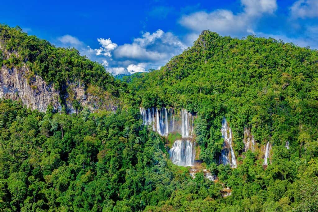 Key Attractions: Thi Lo Su Waterfall The largest limestone mountain waterfall in Thailand, located 900 metres above sea level, originating from Klo Tho Creek cascading along a steep cliff. This multi-tiered waterfall flows strongly all year round. It is about 500 metres wide and 300 metres high, surrounded by lush evergreen forest. The name “Thi Lo Su” comes from the Karen language, meaning “black waterfall.” To get there: By car-From Umphang District, follow Highway No. 1090 (Umphang-Mae Sot route) and take a right turn at Km. 161 (Ban Mae Klong Mai) onto Highway No. 1288 (Ban Mae Klong Mai -Beung Keung) to Delo Pass or the “Umphang Wildlife Sanctuary” checkpoint for 50 kilometres. Visitors should use a pick-up truck or a four-wheel drive car which has high performance. During the rainy season, the route is closed to vehicles to allow forest recovery, and access to tourism during this period requires prior permission from sanctuary officials. There are two access routes; Rafting from Tha Sai, Umphang District along Mae Klong River, a 3-hour journey, followed by a 3-hour, 10-kilometre trek to Thi Lo Su. A 25-kilometre, 4-5-hour trek from Huai Nong Luang ranger station to Thi Lo Su. Thi Lo Cho Waterfall (Namtok Saifon) Located 3 kilometres from Umphang District, accessible by a 40-minute bamboo raft trip along the Mae Klong River, reaching an 80-metres-high waterfall. Thi Lo Re Waterfall Situated on a cliff overhang, resembling a cave on the edge of Mae Klong River, with a large stream flowing over a steep cliff into Mae Klong River, 80 metres high, ideal for adventure tourism and nature studies. To get there: Take the Umphang-Ban Pa La Tha route, starting from the Karen village of Pa La Tha on a rubber dinghy along the Mae Klong River for around 3 days. Note: Visitors must prepare their own meals and camping equipment. Ko Tha Waterfall A beautiful, large waterfall over 100 metres wide and 120 metres high, cascadi