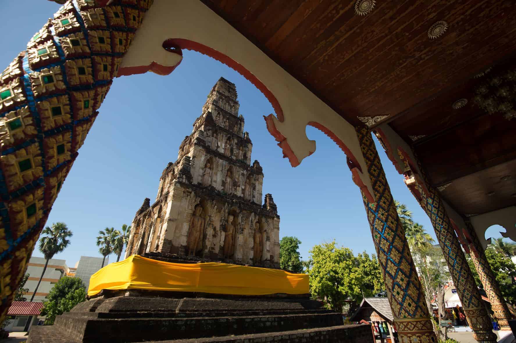 Wat Chamadevi, or as the local people call it Wat Ku Kut, is located on Chamadevi Road, Tambon Nai Mueang. It was built in 755 in the Lavo style. The Chedi is a square structure similar to Bodhgaya in India. Each side has a standing Buddha image in the posture of giving blessings. The ashes of Queen Chamadevi, the first monarch of the Hariphunchai Kingdom, are enshrined within the Chedi. According to legend, Chao Anantayot and Chao Mahantayot, the sons of Queen Chamadevi, built it in the year 755 to enshrine the ashes of the Queen. It was originally wrapped in gold, but this disappeared over time. The local people call it “Ku Kut” or as it is known officially as “Phra Chedi Suwan Changkot”. In addition to this, there is Rattana Chedi, which is located to the right of Wihan Phraya Sanphasit and built in the 12th century. The lowest base is an octagon with a diameter of 4.40 metres and a height of 11.50 metres. The chedi is a square shape, and each square is pierced into an alcove to enshrine a standing Buddha image made of brick and mortar.