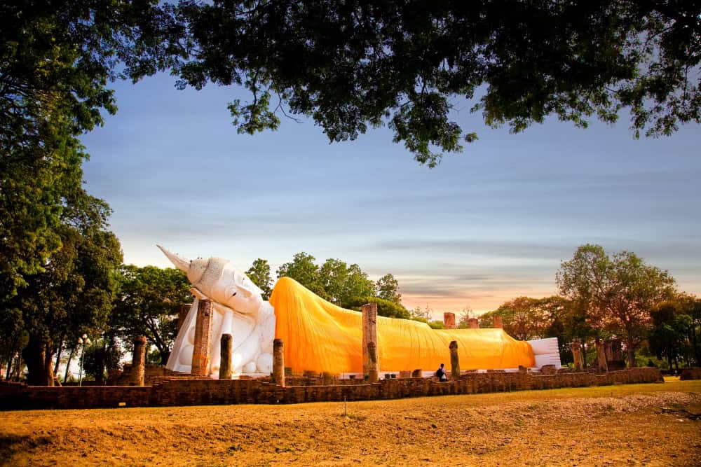 Located within Inthapramun Subdistrict stands Wat Khun Inthapramun, a relic from the Sukhothai era, lies a testament to divine craftsmanship: a resplendent reclining Buddha image, stretching around 50 metres, once housed within an image hall, now a solitary sentinel of time’s passage. The image possesses attractive Buddha features with a smiling face attracting respect from devotees. This colossal masterpiece, akin in size to its counterpart in Sing Buri, has drawn the gaze of royalty across era. From the revered footsteps of King Borommakot to the presence of King Rama V and the gracious visitations of King Ram IX for the royal Kathin robes ceremony. Yet, within the area of this sanctuary lies a touching tale of enigma. The multi-purpose hall, reveals the haunting visage of Khun Inthapramun, lying face down with hands and feet tied behind his back, his mortal remains bound in eternal repose, a silent witness to the secrets of the infamous thief buried within the temple’s ancient heart.
