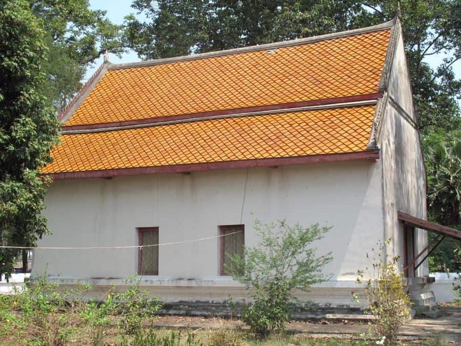 Wat Prasat has the Ubosot or ordination hall and the Wihan (image hall) featuring the architecture of the late Ayutthaya period, a junk-curved base. The large stupa was built around the reigns of King Rama III and IV by local craftsmen. The mural paintings by the craftsmen of the Rattanakosin era are still influenced by those of the Ayutthaya school. The drawing behind the principal Buddha image depicts a pond in the Himmaphan Forest and directional animals. Described on the two side walls is Lord Buddha standing on a lotus base with Buddhist disciples standing on both sides to pay respect. At the back of the temple, there is a dense forest of large Yang trees which are nearly one-hundred years old. The village has mostly traditional Thai houses, and shady fruit orchards.
