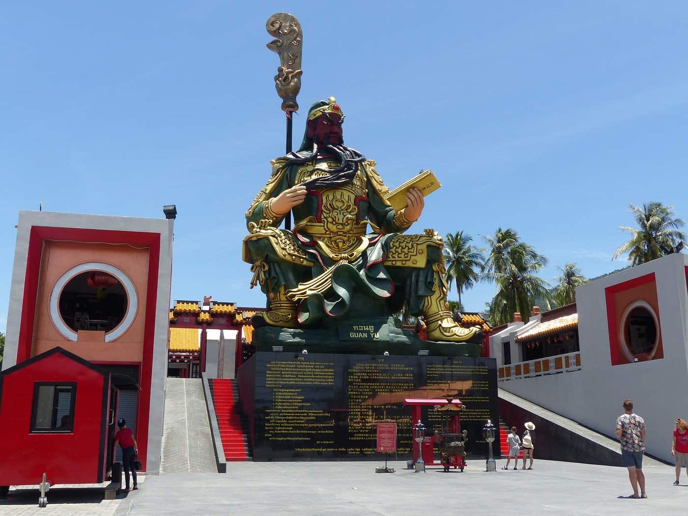 Guan Yu, also known as Yun Chang, was a military general who served under the warlord Liu Bei during the Three Kingdoms era of China. He is known for his loyalty, bravery, and intelligence and is still revered today by many Chinese Buddhists, Confucians, and Taoists. The history of Guan Yu is carved on the base of the statue at the Koh Samui Guan Yu Shrine.